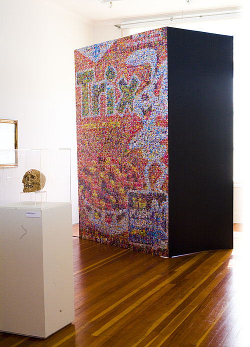 The monolith is a mosaic of over 5,000 boxes, 3,000 of which are unique, dating from the first commercial cereal “Grape Nuts” at the turn of the century. The back of the Monolith is a mosaic of the backs of all the cereal boxes on the front.
